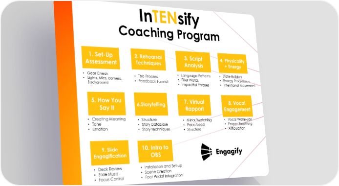 InTENsify Coaching Program 1. Set-Up 2. Rehearsal 3. Script 4. Physicality Assessment Techniques Analysis + Energy • Gear Check • The Process • Language Patterns • State Builders • Lights, Mics, camera, • Feedback Format • Filler Words • Energy Progression Background • Impactful Phrases • Intentional Movement 5. How You 6.Storytelling 7. Virtual 8. Vocal Say It Rapport Engagement • Creating Meaning • Structure • Mirror/Matching • Vocal Warm-ups • Tone • Story Database • Pace/Lead • Proper Breathing • Emotion • Story techniques • Structure • Articulation 9. Slide 10. Intro to Engagification OBS • Deck Review • Installation and Set-up • Slide Musts • Scene Creation • Focus Control • Foot Pedal Integration